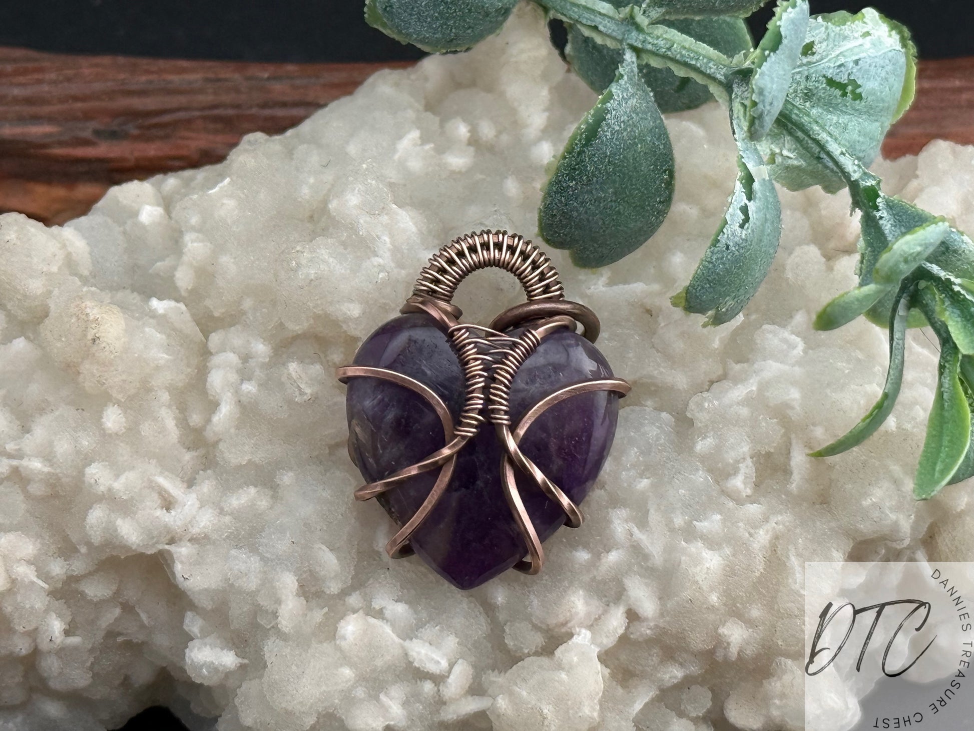 Embodying the exquisite balance of nature’s artistry, the Amethyst Heart Pendant features a lustrous heart of amethyst, elegantly ensconced in delicately antiqued copper wire. This enchanting piece not only serves as a sublime adornment but also whispers of serenity and clarity, inviting the wearer to embrace a harmonious spirit.