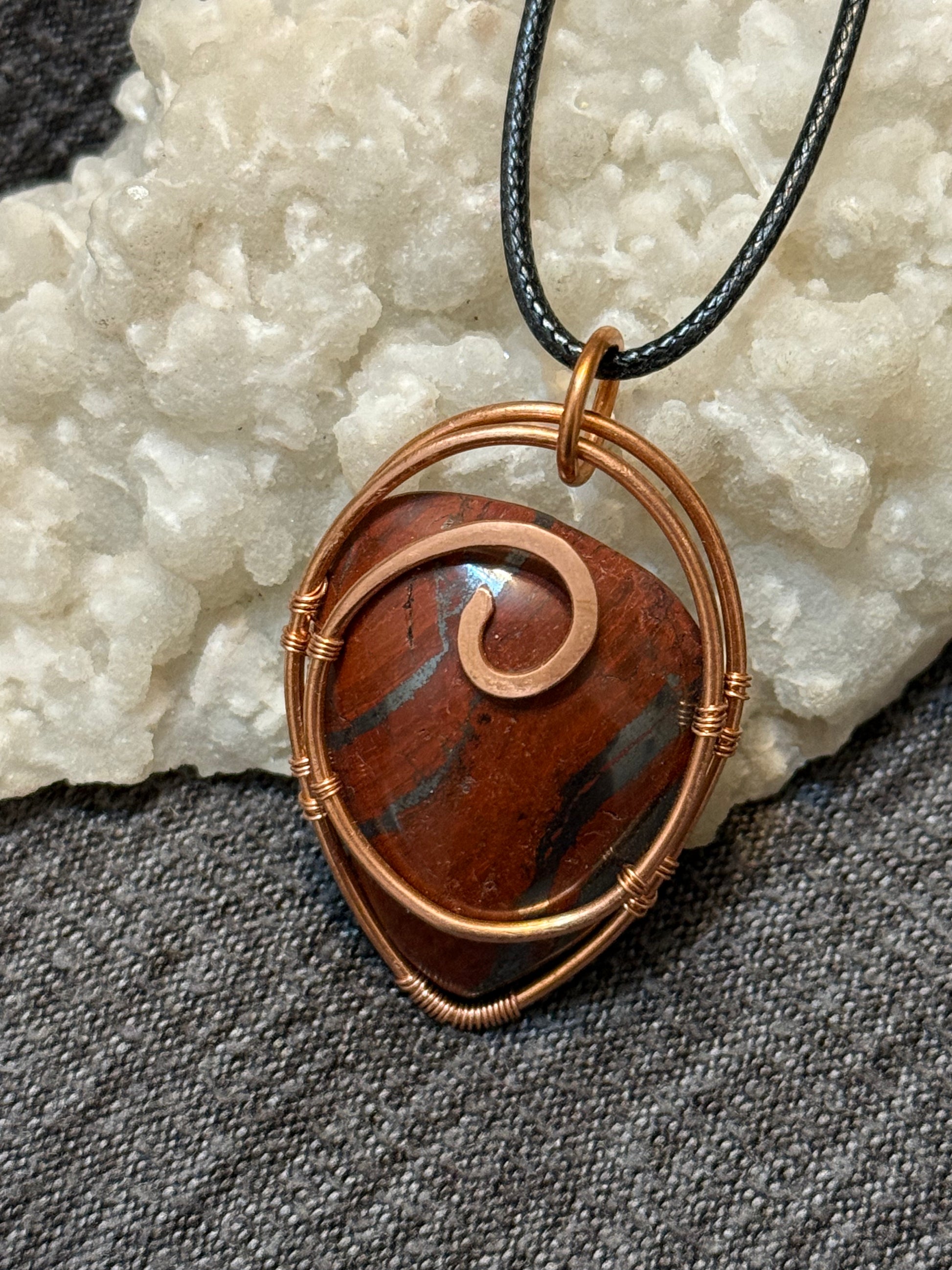 Beautiful, deep red Jasper that is banded with Hematite. This stone was self collected, cut, and polished by hand. It was then wrapped in copper wire.