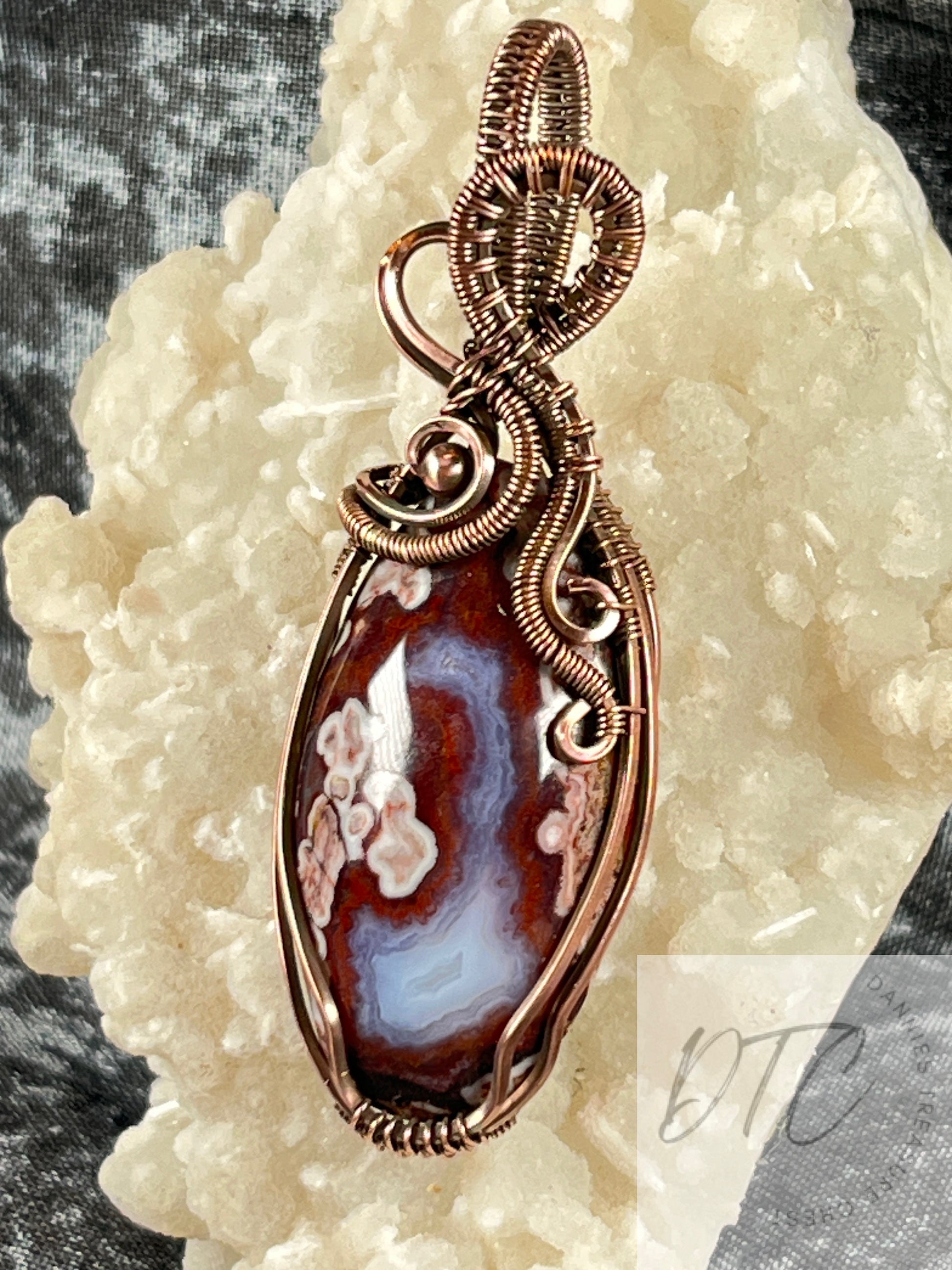 This gorgeous Camp Verde Agate was self collected, then cut, and polished to a mirror shine. It was then wrapped in woven, antiqued copper wire.