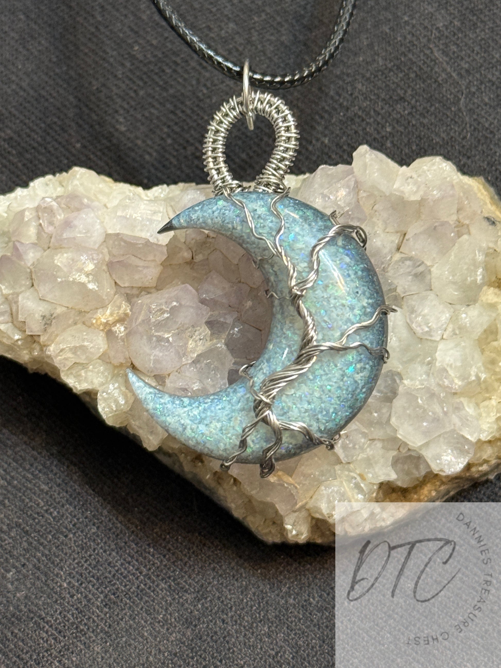 This is a beautiful and sparkly, Crushed Opal, Resin moon that has been wrapped with a stainless steel tree of life.