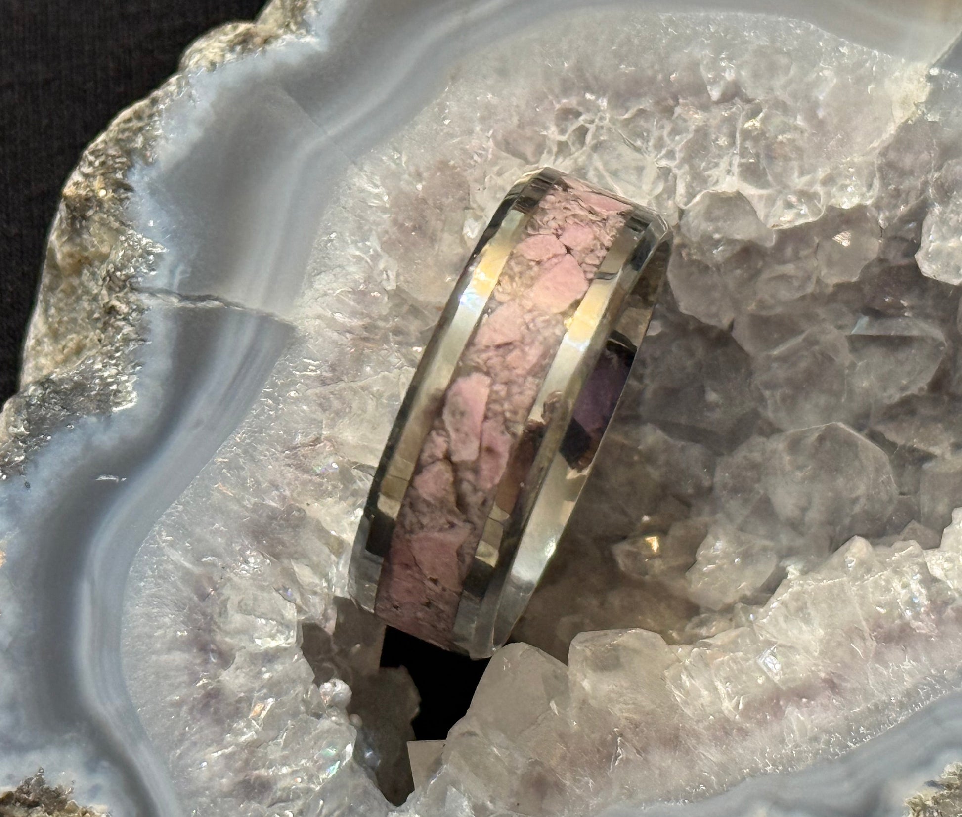 Stainless steel ring that has been inlaid with crushed rhodonite, and then polished to a high shine.